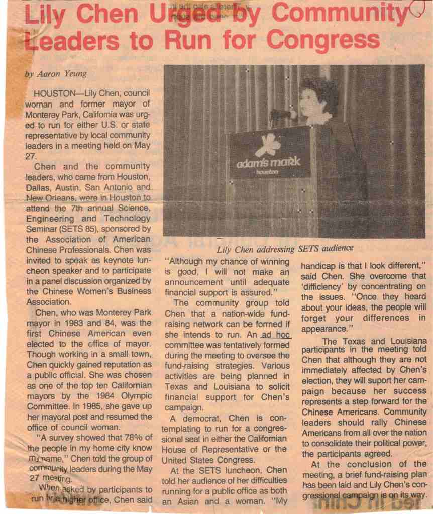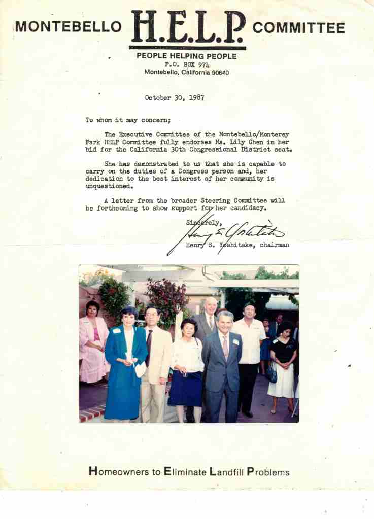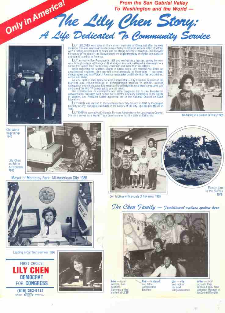 California Governor Pat Brown endorsed Lily to run for the 30th Congressional District in 1988. She ran against the incumbent Matthew Gilbert “Marty” Martínez, a former furniture store owner whose political experience included serving on boards, state assemblyman, and Monterey Park City Council.