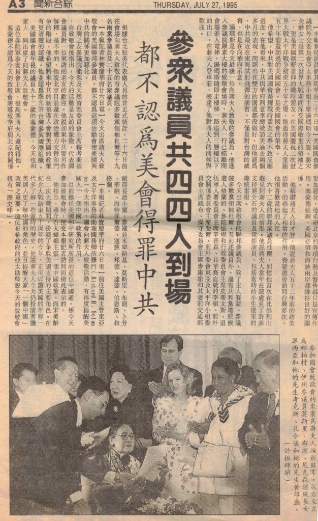 One of Lily’s earliest achievements was her victory at her school’s speech contest. To this day, Lily takes pride in her win as it was a stepping stone towards her later successes. In 1953, Lily was chosen to represent her school at the Young Girls’ Speech Contest. The contest involved picking a subject on the day of the event, requiring contestants to improvise. Lily unknowingly picked the topic, “Service to help people is the source of happiness” (服务为快乐之本), foreshadowing her future career. Lily took to the stage and presented a passionate speech inspired by her love and empathy for her mother’s injustice. Lily argued that helping others was the key to achieving inner happiness. Subsequently, Lily placed first and accepted an award of 300 yuan from Madame Chiang, another figure whom Lily idolized. Madame Chiang’s status as an influential world power proved that women were successful and powerful, and also that the gap between the East and West could be bridged. When Madame Chiang delivered her speech in the U.S. Congress in 1943, there were forty congressional representatives listening, which had never happened before.